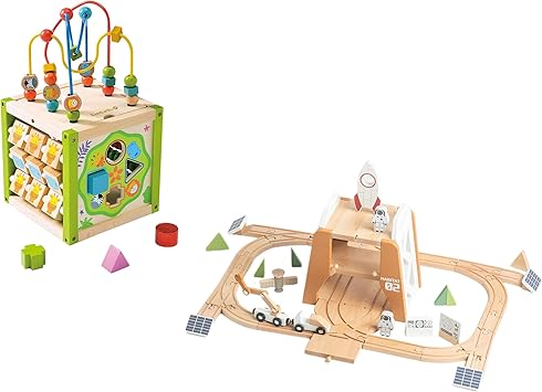 5 in 1 Wooden Activity Cube with Bead Maze Wood Play Center, and Mars Station Wood Train Track Set 39pcs