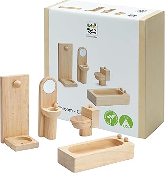 PlanToys® Bathroom Classic Set for Montessori Inspired Home and Small World Play | Practical Life, Social Skills and Imaginative Scene Building | Eco Friendly Wooden Dollhouse Bathroom Furniture