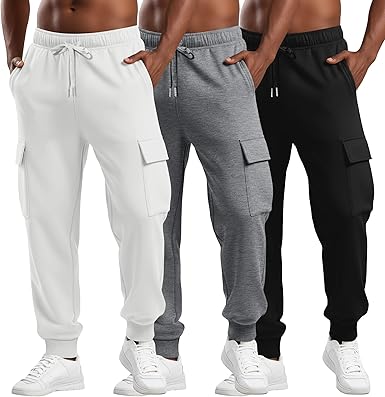 3 Pack Men’s Cargo Sweatpants Relaxed Fit Drawstring Elastic Waist Joggers Active Tapered Pants with Pockets