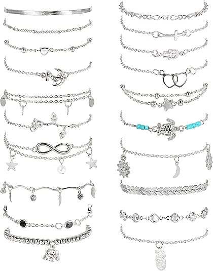 FASACCO 20Pcs Ankle Bracelets for Women Adjustable Beach Anklet Set Surfer Anklet Heart Star Turtle Infinite Anklets Foot Jewelry