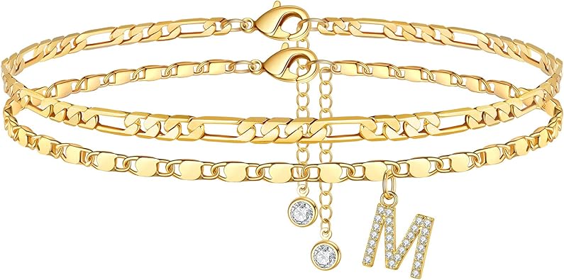 Ursteel Ankle Bracelets for Women, 14K-Gold-Plated Dainty Layered Chain CZ Initial Anklets Set Summer Jewelry Gifts for Women