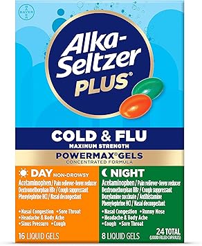 Alka-Seltzer Plus Power Max Cold and Flu Medicine, Day+Night, – Maximum Strength (Per 4 Hour Dose) Relief Cold and Flu Medicine for Adults and Children 12 Years and Older, 24 Count, Packaging May Vary